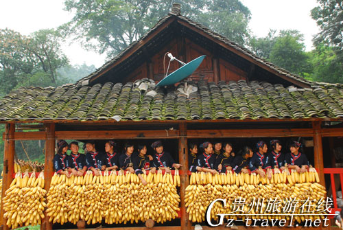 木结构的吊脚楼:这是寨子里比较古老的房子。它们依山就势,前面吊脚,后面靠山,往往是三层结构,底下一层简单装修一下,用来堆放犁、耙、锄、石磨等劳动工具,有的也用来圈养猪、牛。二层三间开面加一个吞口,中间一间为堂屋,用来祭祖、迎客,左右厢房前为火塘、后面住人。装修的比较规整。在厢房前都留有走廊,装修有木栏,可以用来晾晒包谷、辣椒。在房前或两侧房山外修有晒楼,用来晒粮或休息,做衣服、制蜡染、搞刺绣。最上面的一层装修后用来堆放粮食等。屋顶盖的是黑色小瓦。整个房子通风、透气、方便。
