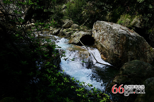 汩汩流淌的溪流、在山石的阻挡下拐弯抹角,激荡起串串水花