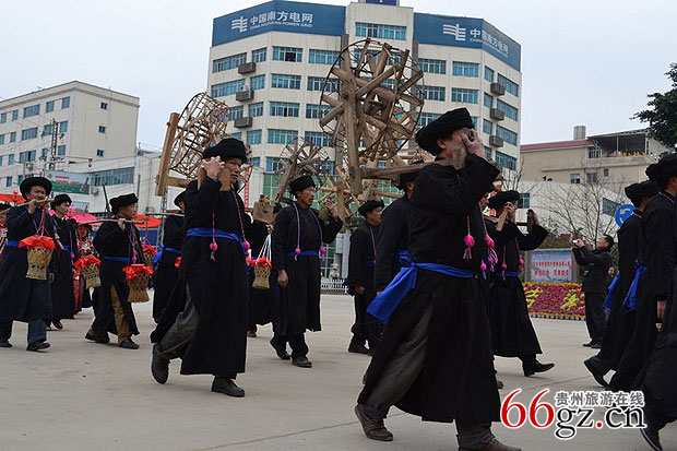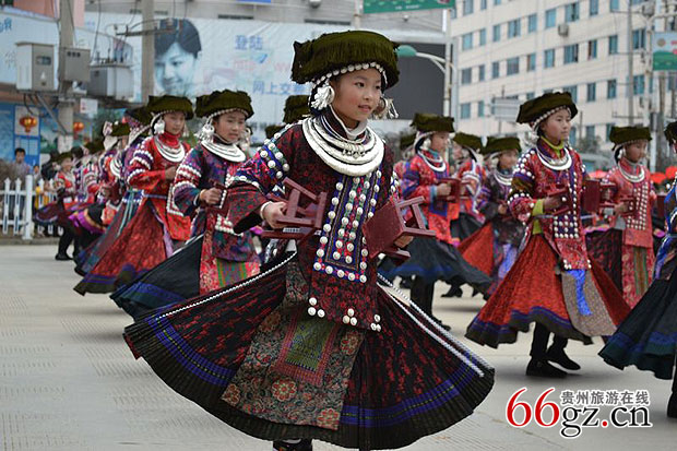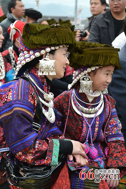 贞丰县城,建在一个四面环山的小盆地里。一条笔直的大道从新城向老城延伸着。这里的人们用榕树和桂皮树作为行道树,很有特色。街道很整洁,很干净。从广场的布标,还有那刚搭建好的舞台布景,我已感到了浓浓的节日气息。在下榻的贞丰宾馆外面,一条醒目的红布标用苗汉语文对照写作:热烈欢迎各位领导、来宾莅临贵州省贞丰苗族“二月二”走亲节。在宾馆的大门,八字分排着二十多位苗族妇女,她们身着苗族盛装,手持牛角和酒杯,盛满自酿的米酒,唱着酒唱,敬献给入住的佳宾。看到此时此景,我的眼泪几乎都要流了,他们的先祖来自于我的家乡,他们不知道来了多少代了,可他们没有忘记故土的习俗,他们还在沿袭过去的习俗。当他们叫一声“勾恰”(相当于汉族的亲家)时,那种亲切感,顿时让我倍感浓烈。他们的语言没有变,交谈中我陪感亲切。我仿佛还是在和我们的家人说话一样方便。我在来之前,一位家乡的老人告诉过我,你到了贞丰,你见到的苗族服装就是两百多年前,我们的先辈穿着的一样。我不知道服饰上的区别来自于什么原因,是我们黄平、施秉的变了或是他们的变了,难道真的是我们变化了服装,那么我们为什么要变呢?不过,我认为还是有不变的,如她们穿在服饰上的锦绣,那些染色——“加旺介”(染布用的染料)没有变,和我们一样,只要她们穿着那身衣服时,她们的手和我们那里的一样,沾着紫色。我不知道为什么她们和我们一样,用一种脱色的染料呢?我想:也许我们的这一支系可能就以这种染料作为区别于另一支系的标志吧。她们的裙子也很艳丽,摆很长,让女人更显得身材的修长和美丽。贞丰苗族至今仍保持简朴的古装不变。留在故土的我们,服饰总是在“与时俱进”,我不知道这是对还是不对?如果某一天变得面目全非,虽说也是一种华丽的转身,想必那也是一种悲哀。到美国的苗族算是“留洋”了,可他们仍然固守着几百年前的样式,很难得,这就是一种民族文化的认同感觉。只有不断增强民族文化认同感,才能增强我们苗族的自豪感、责任心。增强民族文化认同感,就是要积极继承优秀的民族传统文化,大力弘扬我们这一民族的传统美德和民族精神,在实践中不断推进民族文化的创新与发展。
