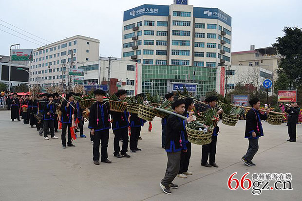 游行是展示苗族文化的主要活动。这一天清晨人们就早早起来穿着盛装了,贞丰的苗族同胞总是将最珍贵衣物、银饰从箱底下取出,正对着镜头,认认真真地打扮了一番。红蛋已早在前一天就已煮好、染色编进了蛋笼,并已挂小孩身上。游行队伍按地区列队,展示的什物多是苗家人的生产生活用品,有扛纺车、有挑鸡鸭的、有酒坛的……芦笙、唢呐吹奏起来,板凳舞、芦笙舞一路的跳着,施秉队带来的被誉为文字活化石的“刻道”棒更是让沿街的观众惊叹不已。苗族酒歌飞歌在小城的上空飘荡,笑声在大街上流动,儿童提蛋队还整齐地口念着苗族童谣……这一切让我感到节日那浓浓的气氛。当游行队伍走近节日的展广场时,广场沸腾了。当一个个充分展示当地的苗族文化艺术和苗族风情的大型苗族特色的歌舞表演到来时,节日活动达到了高潮。那一曲曲优美动听的歌舞旋律,是一曲曲华彩乐章的美丽畅想,那幽默诙谐的表演里浓缩的是与时俱进的新风貌、新憧憬,诠释着贞丰各族人民心中的自豪和坚定,抒发着新时期贞丰各族人民团结一致、锐意进取的壮志豪情,展示了贞丰经济社会发展令人振奋的喜人场景。
