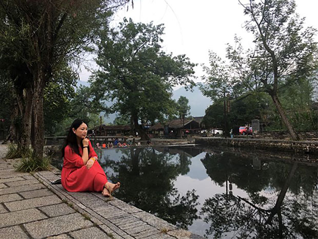 第二天的早晨醒来后发现景区内云雾缭绕,仿佛进了仙境。我们起床后漫步在木栈道中,欣赏湖中的荷花、香水莲,古老的水车,和精致的亭阁,景区内的空气真是清新!