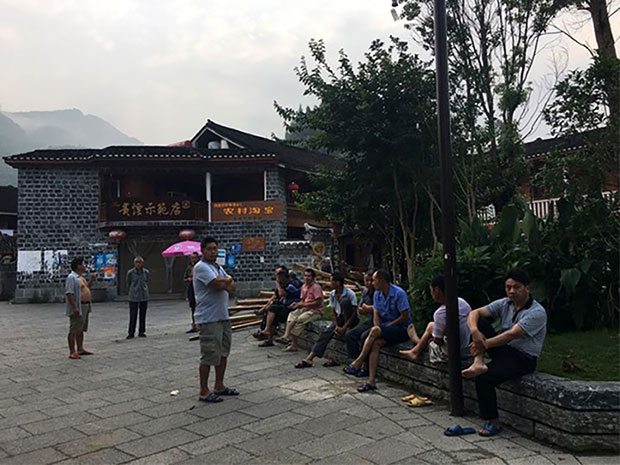 古村里的老人们清早就在家门口吃早餐闲聊。