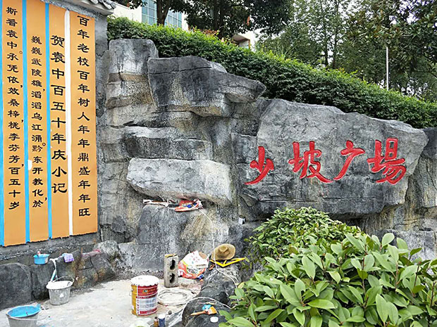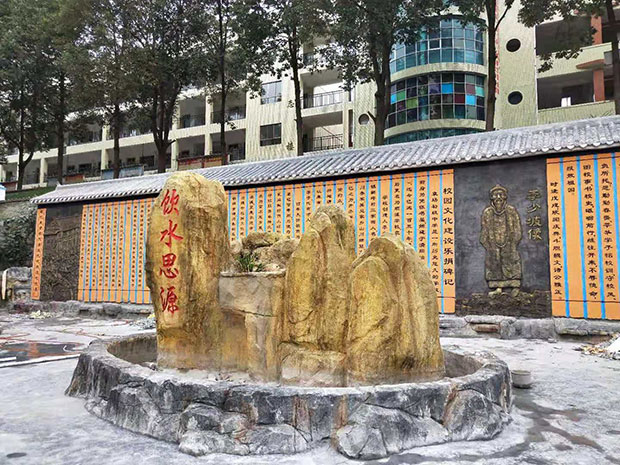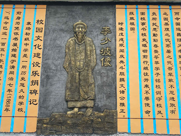 学校创建人李少坡(1819-1888年),袁场镇新坪村三家田人,名兴隆,恩科进士,候补四川参军。其见家乡山川绵亘,文化未开,立志以己之力,开办学堂,以开化地方,培养人才。乃出资约众,于镇之东隅建书房五间,即凭依书屋,并遍请名师,置办学田,以备久远。学校自创办以来有教无类,精益求精,致力铸造辉煌,莘莘学子,代有才人,曾有教育质量首推袁场之誉。百年大计教育为本,前人树立了榜样,我辈岂可等闲?为使母校更具魅力,更具书香味,更具良好育人环境,里人及学子们纷纷反哺母校,报答桑梓。尤其是少坡先生后裔,为弘扬其为官不忘乡里,致富不忘桑梓的乐善好施美德,更是不遗余力,出谋划策,慷慨解囊,从而为提升校园文化建设,提供了丰厚的物质与精神食粮。为表谢意,彰显厚德,在纪念李少坡创办凭依书屋150周年及其逝世130周年之际,特勒石以志纪念……