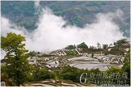 元阳的梯田景观大都分布在新街镇至多依树的山路两侧,沿崎岖公路一路走来,但见水平如镜的梯田依山势从山脚一直延伸到山顶,大的几亩,小的仅几平方米,层层延展,像万道银梯,在晨曦淡淡的阳光照耀下和云雾的交替变幻中,波光粼粼,多姿多彩;梯田与漫山遍野的翠绿和民族村寨子交相呼应,宏伟壮观,气势磅礴,和谐美丽。