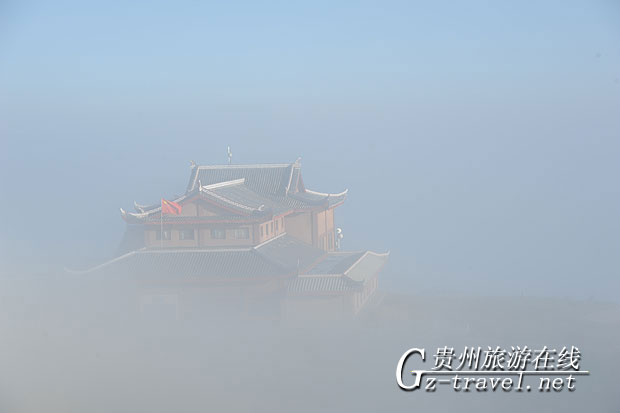 正准备收拾相机回去吃早餐,忽然,一阵大雾从西边吹来,弥漫了整个金顶,金顶下边的索道站也被这大雾弥漫着只露出一个屋顶,如梦如幻。哥哥最喜欢这种景色,他对我说,雾中的景致是最让人捉摸不透的,也是最让人遐想的。哥哥说的很有道理,看着哥哥拍照时那专注的样子,我站在一旁连大气也不敢出,暗暗为他鼓劲,直到大雾散去,我才凑近哥哥的相机一看,呀,真是太美了,雾景原来也这么好看!