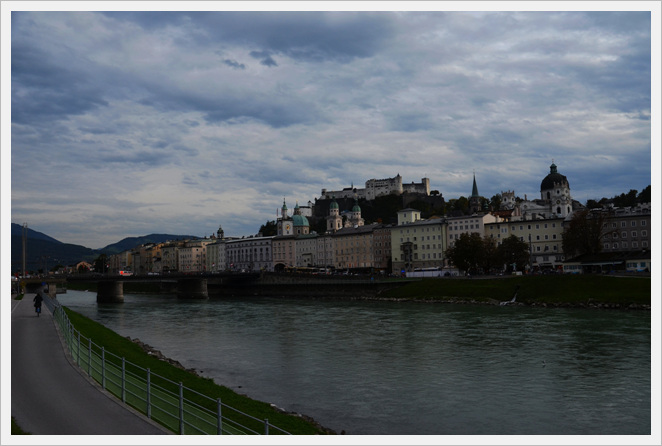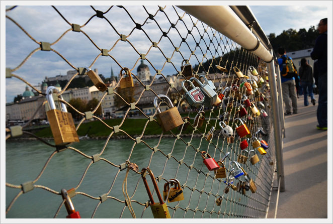 立于美丽的米拉尔宫殿花园当中,正面看去,高高的立于山上的正是玛利亚曾经修学的修道院——萨尔茨堡,这是阿尔卑斯山北部地区最古老的女修道院。从公元714年建成以来一直保存到现在,期间,它曾经历过几次火灾,但总能被当时的统治者重建,最后一次重建是在16世纪初期。天色渐暗,我们循着古堡的方向,走出花园,穿过一个街区,再过横跨在萨尔茨河,便进入了老城——音乐天才莫扎特的出生地就在河的对岸。有点意思的是,萨尔茨河桥上的扶栏是金属的铁丝网状的,上面挂满了大大小小的锁,听说是年轻的情侣们为了锁住彼此的海誓山盟希望永结同心而表达的美好愿望。看来,这座横跨新旧两座城区的桥梁,依然在随着时间的推移而续写着不断的爱情故事。