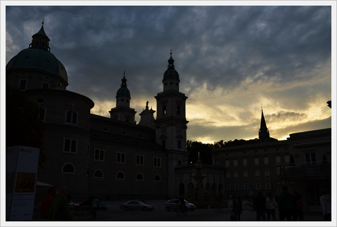 随着夜幕的徐徐降临,我顺着莫扎特故居旁那条狭长的街道漫步,这条叫做“粮食胡同”(getreidegasse)的步行街因莫扎特1756年1月27日出生在这条街的9号而使之享誉世界(莫扎特的父亲雷欧彼得•莫扎特在1747年租下了这栋楼的第4层,他们一家在这里一直生活到1773年才离开去了维也纳)。街的那一头是莫扎特广场和著名的萨尔斯堡大教堂。