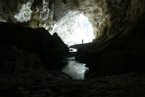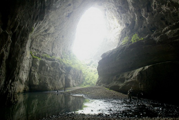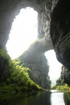 沿一条随时都会扎破胎的乡道驱车抵达下江村后,穿过村后山一片密林,当双虹洞在树丛后猛然出现在眼帘时,我们惊叹大自然的鬼斧神工,造化出这个让人叹为观止的巨大洞府来。双虹洞集天坑、天生桥、溶洞、暗河和工事为一体的山洞,是我平生所见最壮观和神奇的溶洞之一。