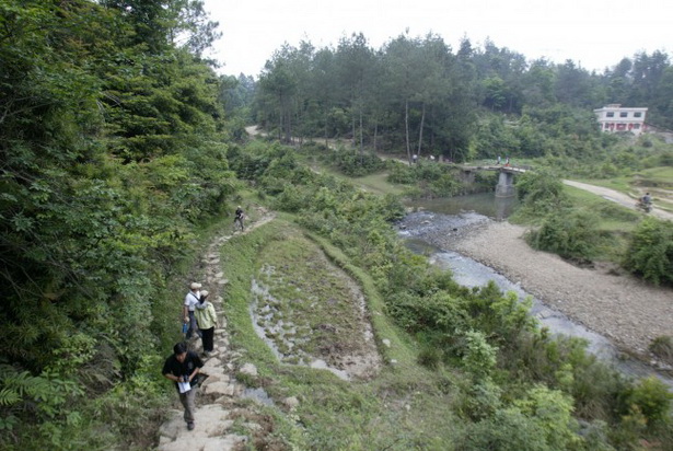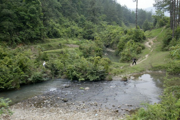 返回上司步行一个多小时,终于找到徐公笔下“其西石峰突兀,至此北尽”的小关。然后来到游记中所说的“有村在西山坞中,为苴查村”的知查村,再沿着小河旁古道前行三里抵达土井村民组,果然看到“又三里,水分二支来,一自西北,一自东北,如丫字会于中支山尽处。”