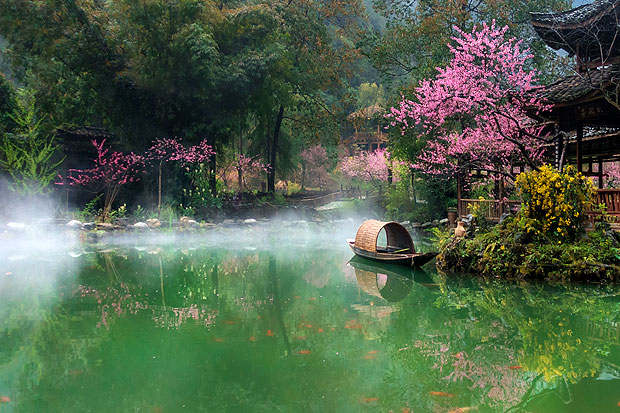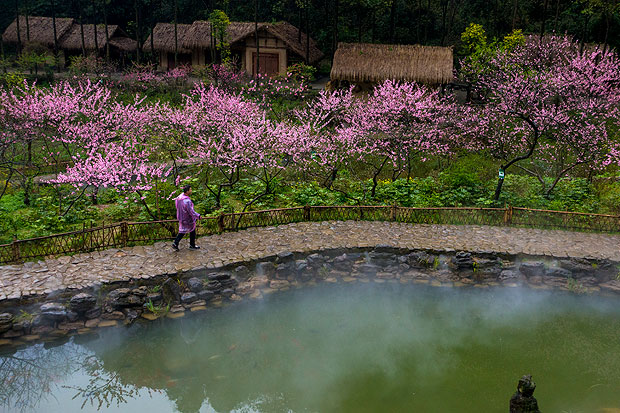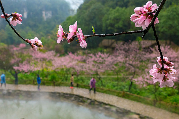 酉阳桃花源景区,是一个距今3亿年,“天坑、溶洞、地下河”三位一体的退化天坑,与世隔绝,隐逸悠远。听说每年三月烟雨时节,桃花源内桃花盛开,柳丝婉转。全国各地的游客为了一睹陶渊明笔下的世外桃源,都会不远千里来到这里。当我们踏进景区大门,双眼瞬间就被大片的桃红柳绿覆盖了......沿着鹅卵石铺就的小道一路走,我一边默念《桃花源记》,一边体验“晋太元中,武陵人捕鱼为业,缘溪行,忘路之远近……”,仿佛自己是那个打渔郎,细细地,在源内多处打造还原的古代市井生活场景中游走感受,品茶、推磨、腌菜、竹编……似乎一个转身便可回到古时,误入世外桃源。