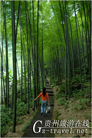 这是位于赤水市桫椤自然保护区内的一条小路,从大门进去不远,过一座小桥,便有一条小路顺小溪右岸绵延而上,小路在竹林里穿行,直往纵深里去,不见尽头,密密的竹海也顺山势旖旎绵延,苍翠欲滴。路下边的小溪汩汩流淌着,溪水忽而湍急,忽而平缓,碰上乱石就绕开而行,不予争雄,哗哗然自顾东去,把它的柔弱一面表现得淋漓尽致,让人看了不能不心生怜爱。然而,世间任何事物都有它的两面性,这水也不例外。海岸边的花岗石硬不硬?然而在海水千百年的冲刷下,竟也变得千疮百孔,面目狰狞。屋檐下铺就的石板硬不硬?然而在经年的雨水滴答下,却被柔弱的雨水钻出了一个个小孔,“雨滴石穿”就是这个道理。故自古以来人们都喜欢引以激励后人做什么事都要“持之以恒,锲而不舍”。
