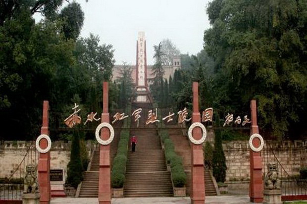 赤水红军陵园,位于赤水市城区南郊杉树坝,是全国第一个纪念“四渡赤水”战役中牺牲的红军烈士而修建的陵园,以其展现“四渡赤水”长征文化的真实性、完整性和独特性,是其他烈士陵园无可替代的。在建设过程中,党和国家领导人杨尚昆、聂荣臻、张震等一大批老领导纷纷为陵园题词。陵园建筑依山就势,环境优美,古木参天,庄严肃穆,由主体陵园(约21亩),百竹园、香樟古树园三部组成,有大理石碑记绘中央红军四渡赤水战役经过示意图一幅。在陵园陈列馆内有60幅图片,内容包括四渡赤水战役、领导人题词,红军标语及红军用过的武器弹药、赤水革命老区的历史等。赤水红军烈士陵园是全国烈士陵园重点保护单位,于1998年4月被贵州团省委命名为少年教育基地”;2000年5月被共青团中央命名为“全国青少年教育基地”;2002年9月又被确定为“国防大学教学教育基地”。