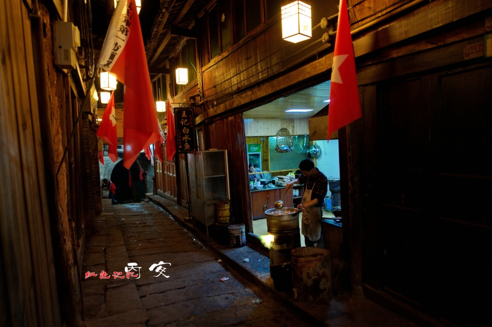 由于天色已晚,古镇上已没有白天那种熙熙攘攘场面,一切都是那么的宁静,只有很少的游客像我们一样行走在古镇的小街上,悠闲地四处张望,仿佛在寻找着什么;此时的古镇,绝大多数的商铺已关门歇息,只有几家餐馆仍支着火炉,灶上煮着第二天将要出售的筒笋等颇具当地特色的食材;在古镇的山门下,一个男孩正在舂辣椒,呛鼻的味道使人透不过气来,不知他们天天如此劳作,是否也和我们一样能感觉的呛人;从一间透着灯光的房门望去,爱好麻将、扑克牌的牌友正在切磋,和城里的人一样,这也是小镇的一种休闲方式。