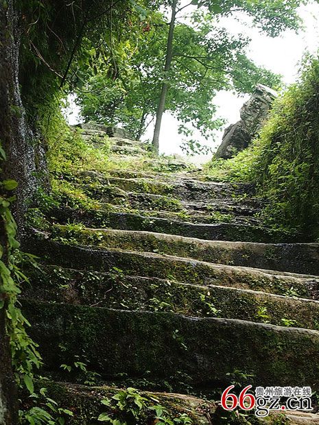 站在飞虎关前,山风很大,却觉得凉爽,这一刻,你才会发觉这数十步的石梯,早已经让人汗流浃背。这份凉爽,不仅因为风,还有耳畔若有若无的水滴声响。飞虎关后就是依山凿出的石梯,相对“天梯”平缓很多,有山泉顺着石壁流淌,真是很好的安排!山泉清澈,可以解渴,可以洗去脸上的汗滴,可以用清脆的声响让人舒缓刚才攀爬的狼狈。