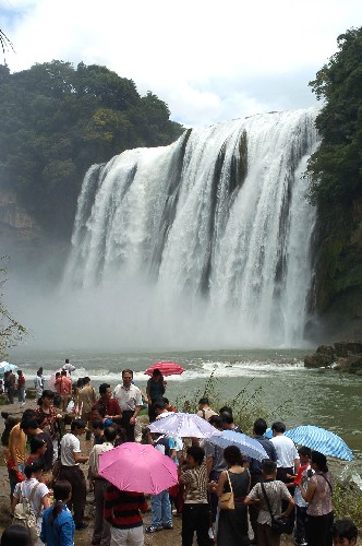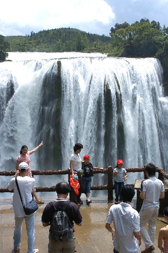 新华网贵州频道8月9日电 8月7日,游客们在黄果树大瀑布前观赏大瀑布,并拍照留念。目前,著名的国家级风景区黄果树瀑布水量充沛,气候凉爽,进入旅游黄金季节,每天有近万游客前来观赏大瀑布的雄姿。8月16日,“2004中国贵州安顺黄果树瀑布节”将在这里举行。