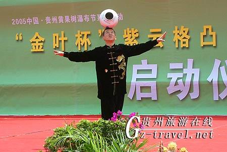 中共安顺市常委、副市长杨梦龙向启动仪式致辞,贵州省旅游局副局长傅迎春向神秘蜘蛛人授旗,活动正式拉开序幕。大型的清代古装秀,紫云格凸民族服饰模特秀的精彩亮相,让广大贵阳市民一饱眼福。“多彩贵州”歌唱大赛获奖选手的助阵,应邀在法国演出获“银狮奖”刘静的“顶缸”杂技表演把活动推向一个又一个高潮。