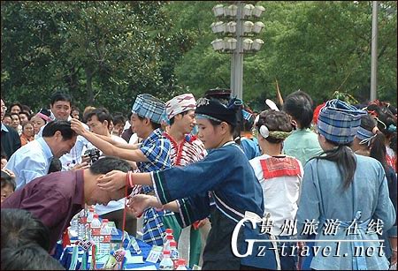 布依青年向嘉宾敬献象征着紫云格凸布依少数民族青年男女爱情的定情礼物