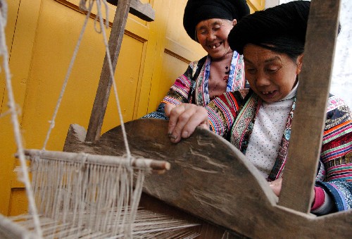 2月24日,贵州省清镇市流长乡腰岩村苗族老人用织布机织传统的花衣布。