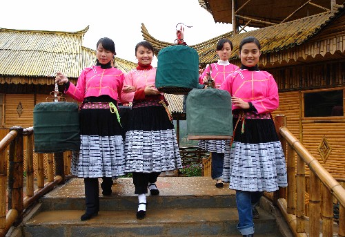 几名苗家女青年提着参加比赛的画眉鸟入场。