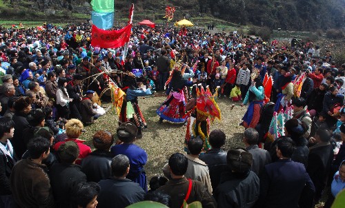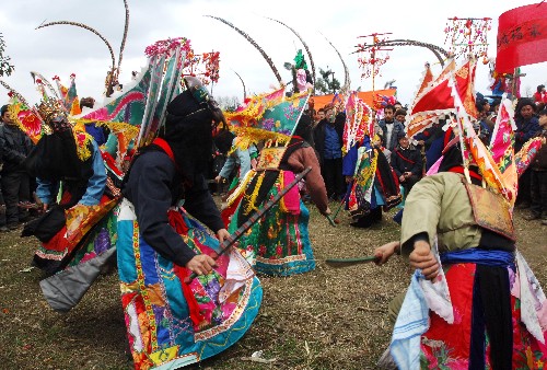 2月23日,屯堡地戏班子在田间表演地戏《杨家将》。