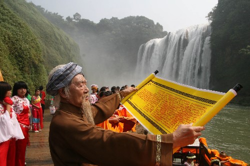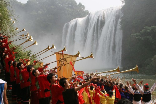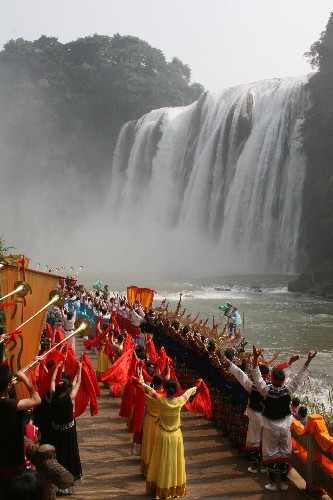 当日,由黄河壶口风景区、黄山风景区和黄果树风景区共同举办的“黄河·黄山·黄果树唱山祭水大典”在贵州黄果树大瀑布下隆重举行。庄严壮美的唱山祭水仪式和动人的民俗风情表演吸引了许多游人。
