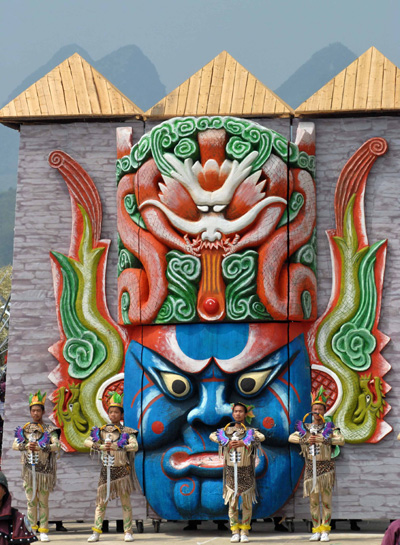 9月19日,在贵州黄果树瀑布节开幕式文艺演出中,巨型屯堡地戏人物面具亮相。