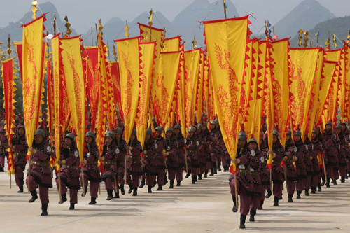 9月19日,在贵州黄果树瀑布节开幕式文艺演出中,演员表演明代将士出征的场面。