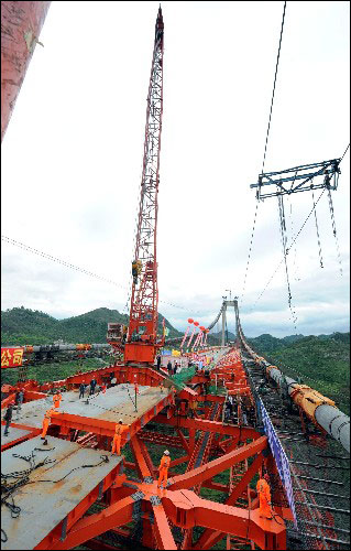 5月18日,工人在贵州坝陵河特大桥上施工。