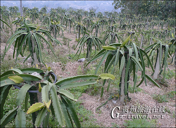 火龙果属仙人掌科植物,营养十分丰富,主要营养成分有蛋白质 、膳食纤维、维生素b2、维生素b3、维生素c、铁、磷、镁、钾等。原产于热带沙漠地区,具有很强的抗干旱、耐贫瘠能力。而关岭自治县位于贵州省中西部,国土面积1468平方公里,境内海拔1850米—490米,为典型的喀斯特生态环境和严重石漠化地区,气候呈立体分布,冬无严寒、夏无酷暑,非常适宜种植火龙果。关岭自治县委、县人民政府以科学发展观为指导,提出了举全县之力,建设“旅游大县”、“绿色经济强县”的发展目标,充分发挥立体气候优势,将推动特色农产品产业化与石漠化综合治理相结合,以基地农产品带动优势农产品向标准化、无公害、特色化和规模化快递发展。该县于2005年由省果树科学研究所引进火龙果,在板贵乡示范园区试种成功,其“红肉型”品种火龙果品质及口感均属上乘,在2007年成都国际农产品博览会上荣获金奖,且经济效益显著,开辟了该县低海拔河谷地区农户的增收渠道和生物治理石漠化的有效途径。4年来,该县获省农委支持精品水果项目投入283万元,并协调水利、交通等部门,解决了火龙果种植示范区的水利、交通等问题,有力推动了全县精品火龙果基地建设。与此同时,以色彩艳丽的绿树白花、形体奇特的红果为吸引物,开辟以观赏、品尝、采摘火龙果为主题活动的生态林业观光乡村旅游,促进农民就业和新农村建设。