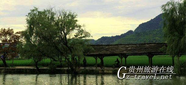 寨边的河水清澈见底,游鱼成群,河上建有一座长30米、宽5 米的五孔石桥,弧形石拱与倒影连成一个个圆洞门。岸边的绿树青山,映在圆洞里,如同五彩的山水彩屏。