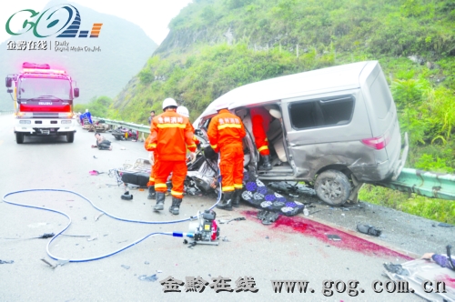 9月26日上午7时20分,关岭县关兴公路3公里处西坡坪隧道口发生一起交通事故,一辆雪佛兰轿车与一辆长安轿车相撞,长安车失控撞向路边停靠的摩托车,过往的一辆皮卡车因车速过快也撞向摩托车群,两人当场死亡,5人受伤,其中2人被困在变形的长安车上,关岭自治消防大队8名官兵接到报警后,立即到场实施救援,成功将被困人员救出,送往医院救治。事故原因正在调查中。