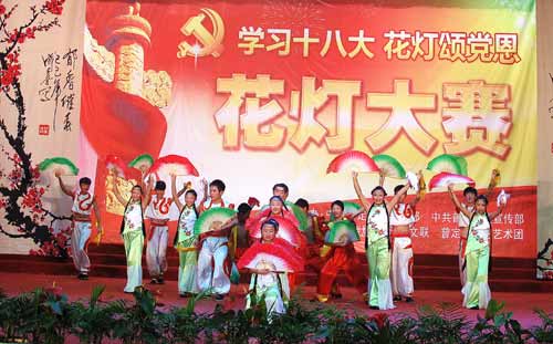 5月28日,普定县文化中心人头攒动,彩旗招展,锣鼓喧天,普定“学习十八大,花灯颂党恩”花灯大赛拉开序幕,来自全县11个乡镇的11支花灯代表队为普定的父老乡亲送上一道丰厚的花灯文化大餐。