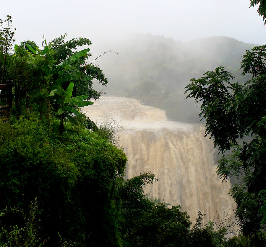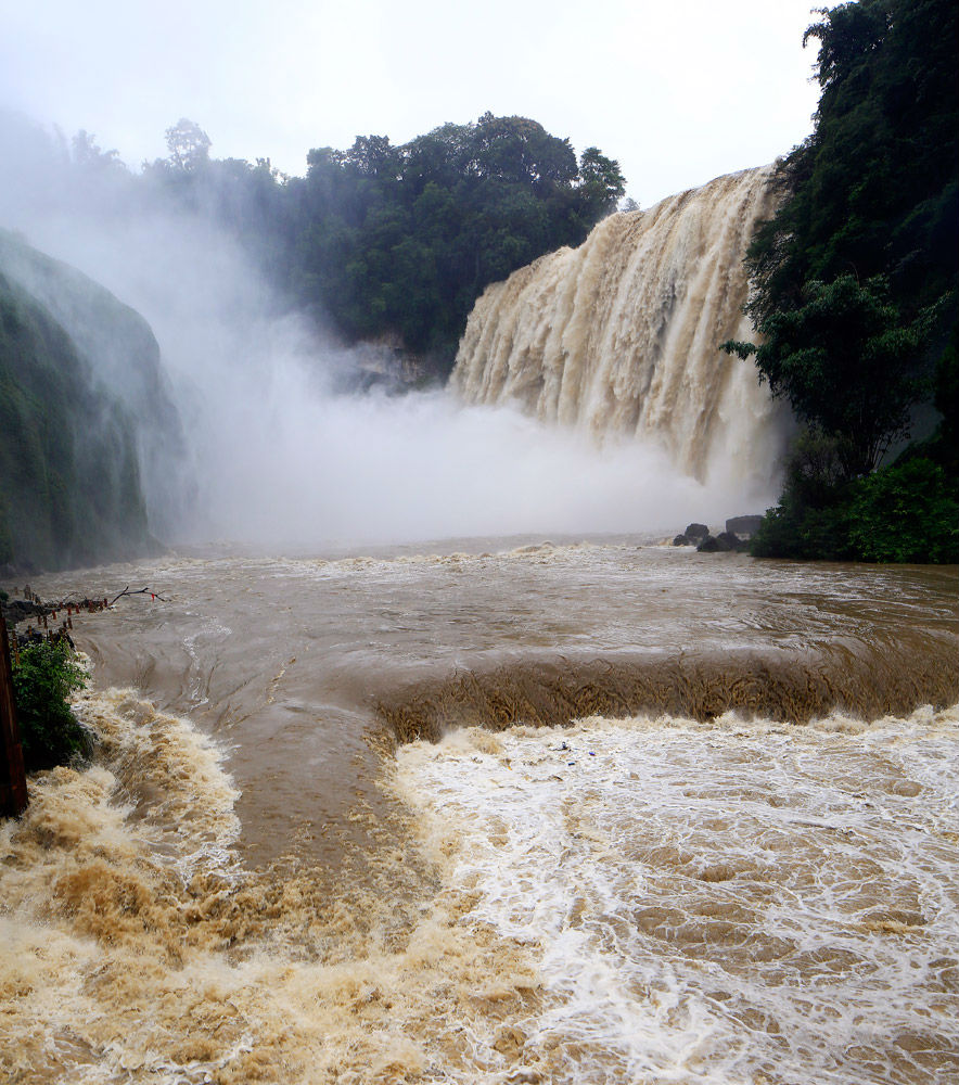 黄果树的秋天一般是以多云的天气为主,秋降暴雨,瀑布涨水,是极少见的,2007年秋天大雨过后的瀑布流量也只达到了120多立方米每秒。据贵州省气象台信息,受到今年第15 号台风“海鸥”的影响,导致了这次强降雨。