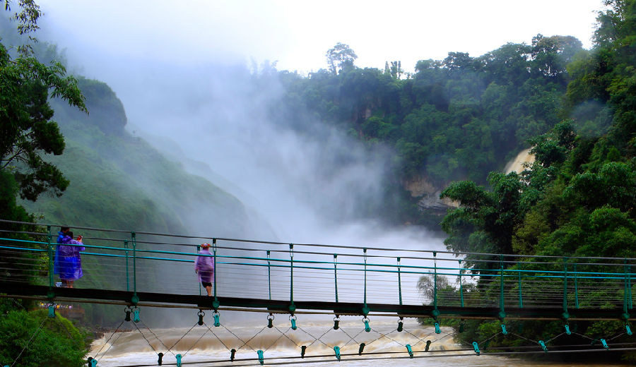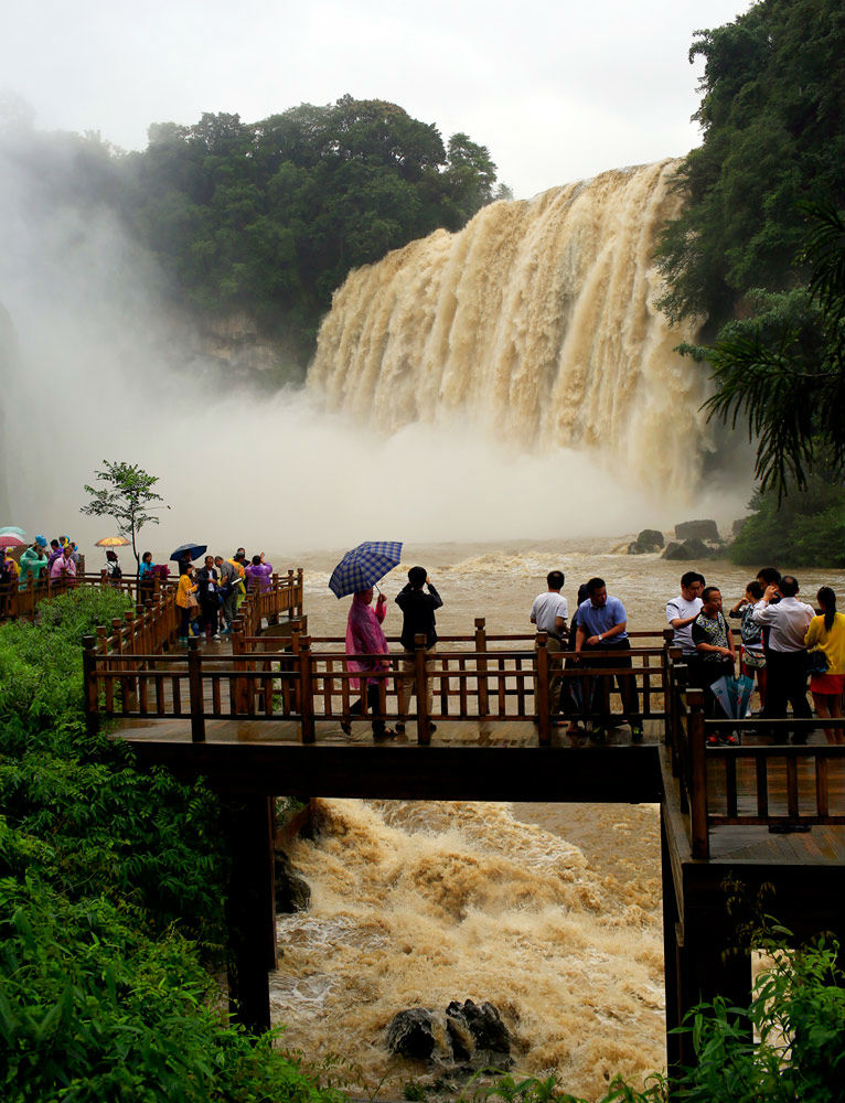 大雨过后的瀑布瀑水浑浊,狂奔着,怒吼着,自78米高的岩石上翻滚而下,倾泻犀牛潭,水声震天,响彻山谷。激起的水雾弥漫在景区的峡谷中,层层叠叠,笼罩着半边街天主教堂、古榕园、房车营地,银杏金黄,花草鲜美,恍如仙境。