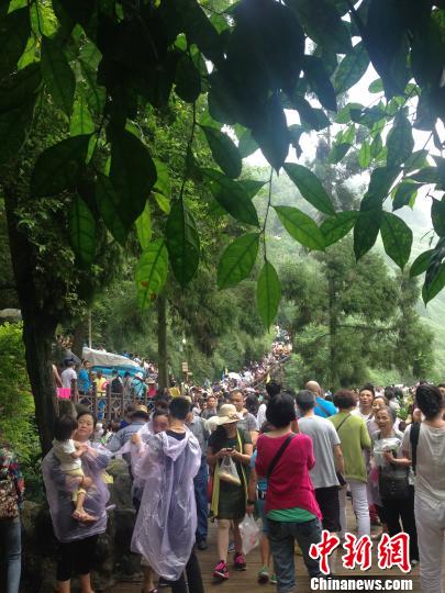 图为黄果树瀑布景区前往“水帘洞”的路上,游客已连成“人龙”。 杨茜 摄