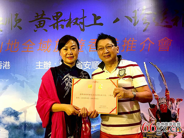 安顺市旅游局局长顾新蔚向黄照康先生颁发安顺旅游大使聘书