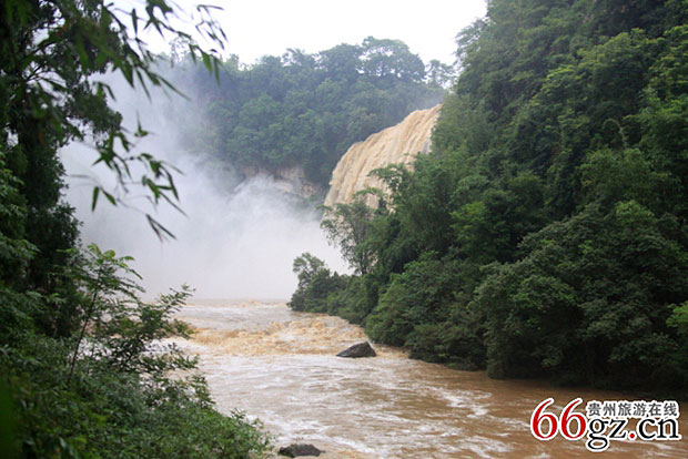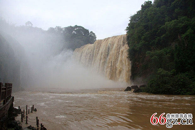 大雨过后的瀑布,瀑水浑浊,水声震天,非常壮观。