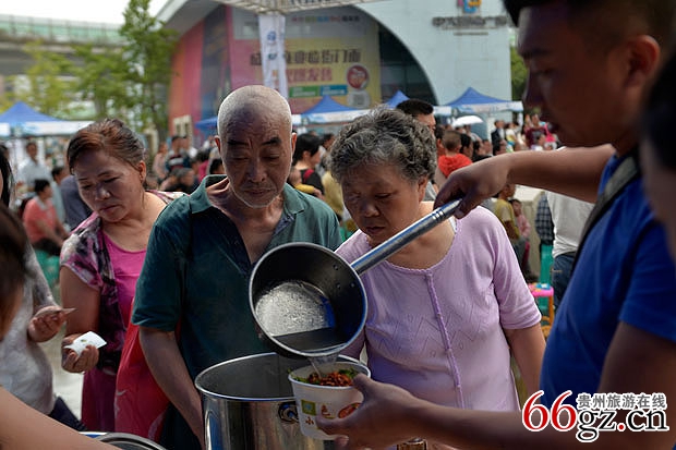 品尝平坝牛肉粉的人群在推介会现场排起了长龙