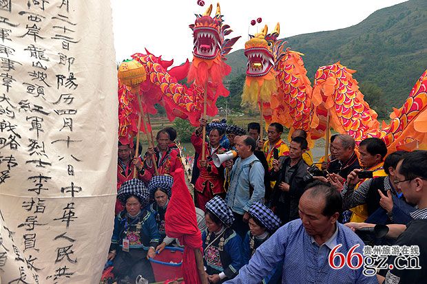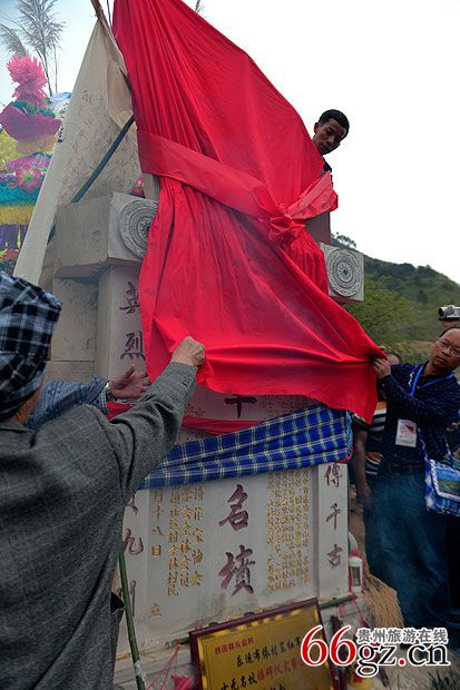揭碑仪式上,布依族摩师诵读布依族摩经,参与战斗的革命先烈的后代纷纷来到坟前诉说哀思。继而烟花爆竹齐放,长号、唢呐、铜鼓齐鸣,勒尤、腰鼓、海螺、牛角八音座唱、军乐队齐奏。