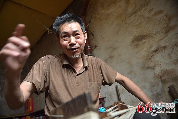 鲍友林是屯堡服饰协会副会长 ,今年63岁,从18岁开始做丝头系腰。大家一边拍摄鲍师傅制做腰带,一边听他介绍制作的工艺:从经线、纬线穿线开始,两头的通带,中间的花板,两边的丝头,312根经线,32路96根192根打丝,32路一路65个疙瘩,将穿过梳板、皮钱的经线与着纬线用砍刀织出,花板上翻花,翻花图案有双枣、双万、双寿及双喜等,还可以翻定制到图案,最后的一道工序是将白色的丝头系腰染成黑色。