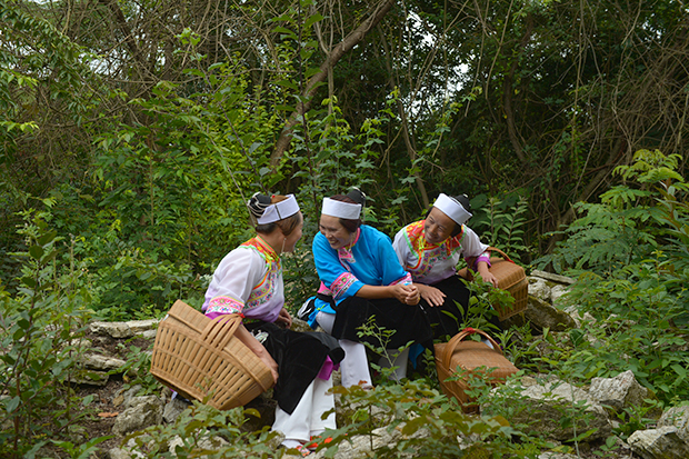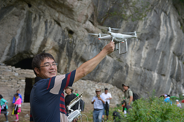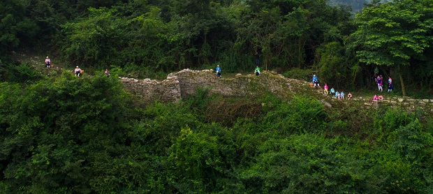 采风团员首先探秘傅家寨的军饷洞。傅家寨北侧山叫"屯上",意为屯兵之地,因当年傅友德大本营屯军于此而得名。村民自发修建了上山的台阶,拾级而上,屯上四周的古城墙、瞭望口、烽火台、防御垛口等遗址仍较为完好。从屯上山顶往南下到山腰,就到了军饷洞口(现在被称着“留洞”),团员们打着手电一起艰辛地穿过漆黑的军饷洞,虽然辛苦,但也欣赏到洞内钟乳石、石幔、石柱的千姿百态。