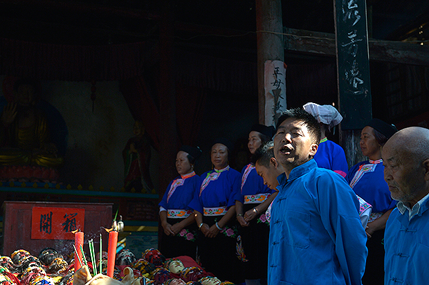 九溪村是九条河的汇集地,是整个屯堡村寨中最大的自然村,在屯堡文化研究中有着举足轻重的地位。采风团员一行如约来到九溪,在龙泉寺拍摄九溪后街男子地戏队(九溪共三个男子地戏队,其它两个是大堡和小堡)的表演。表演首先是传统、庄重的地戏开箱仪式,仪式分5个部分:读祝词、点鸡、请脸、过罈及鸣炮。之后是表演《五虎平南》的选段。原生态的开箱仪式、地戏队员随着剧情变换的矫健身姿,让采风团员再次兴奋起来,沉浸在屯堡文化摄影创作之中。