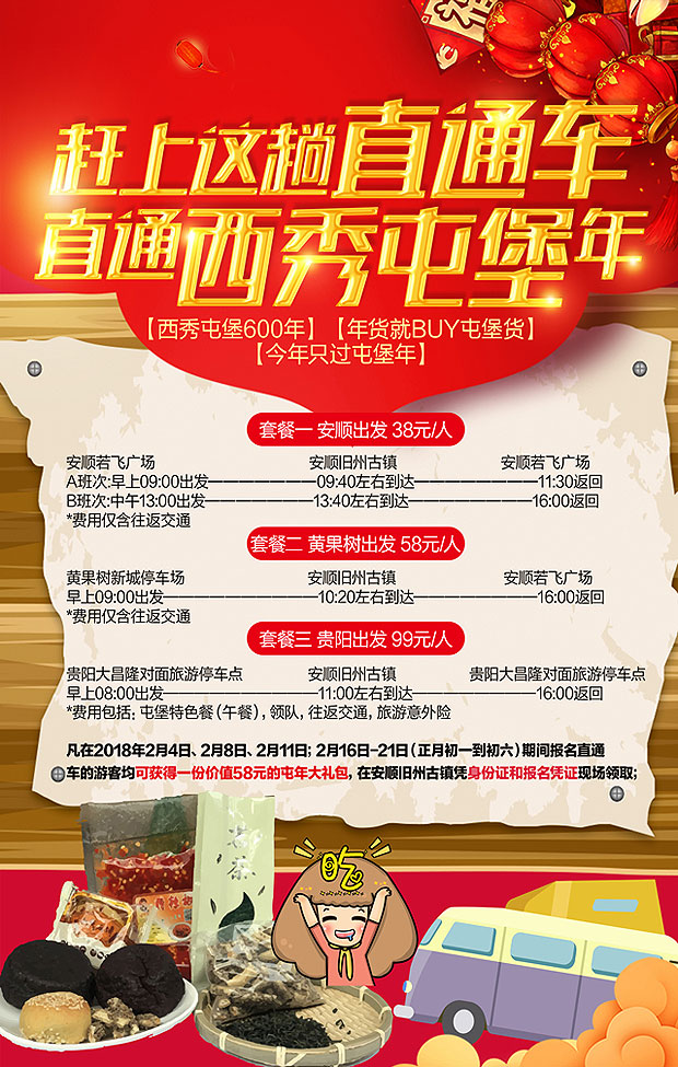 1、直通车大礼包:凡2月8日之后报名安顺、黄果树、贵阳往返直通车这三个套餐,前往安顺旧州参加年货节的旅客,每人将获赠价值58元的年货大礼包一份,在安顺旧州古镇现场赠送(领取地点参照现场指引图)。