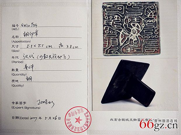 2007年5月26日经北京文物局研究馆员、从事文物鉴定38年的孙晓虹专家鉴定,这枚夜郎王自制的王印的材质为汉代文物。