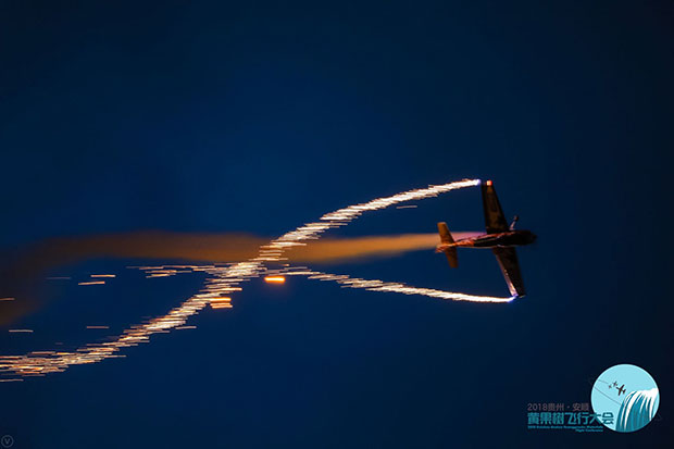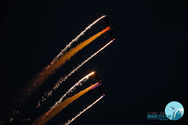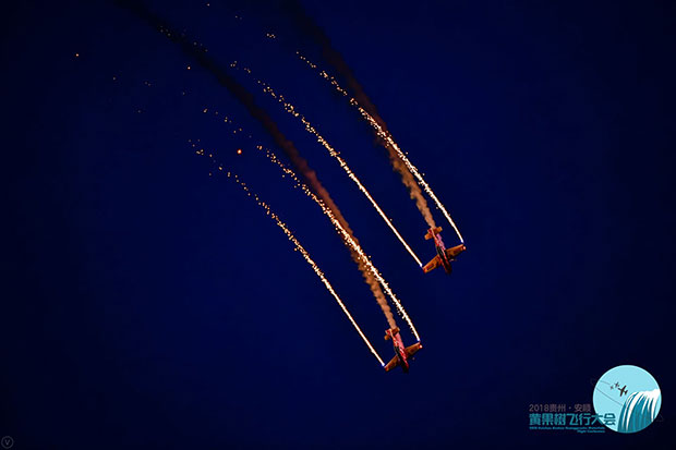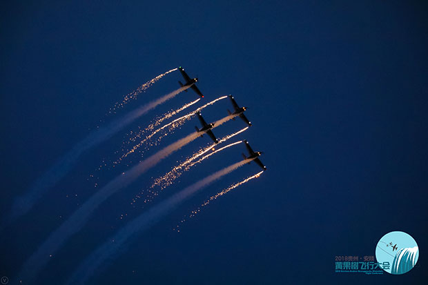 贵州旅游在线讯 8月3日,主题为“逐梦蓝天·黔程安顺”的2018贵州·安顺黄果树飞行大会正式拉开帷幕。来自不同国家的7支飞行表演队的18架飞机轮番升空,在黄果树机场上空上演了大编队通场、多机编队、机翼行走、内外筋斗等高难度特技飞行表演,引人惊叹。