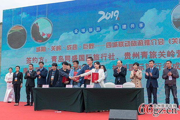 推介会上,城阳区、成县、巨野县、关岭自治县分别进行了精彩的旅游推介,四地旅行商代表签署《旅游合作协议》。
