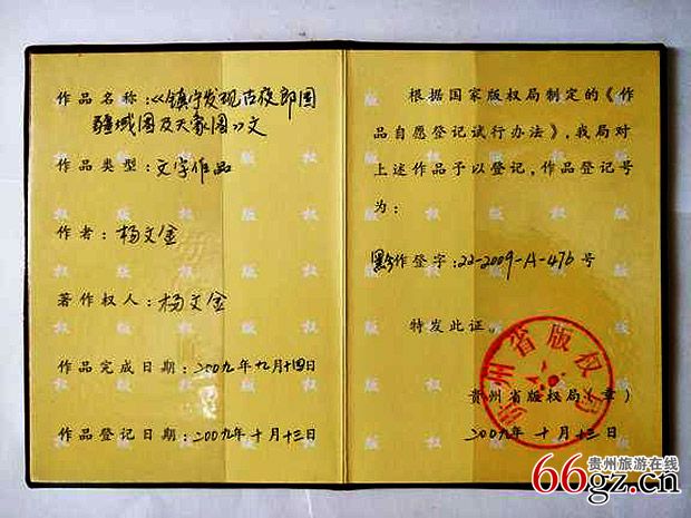 经贵州省版权局审核,合乎中华人民共和国著作权法规定,于2009年10月13日给我颁发了著作权证书。