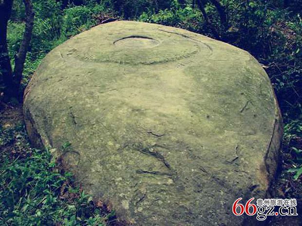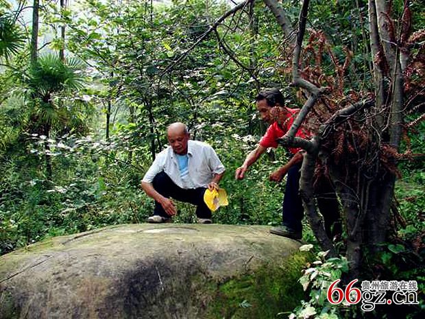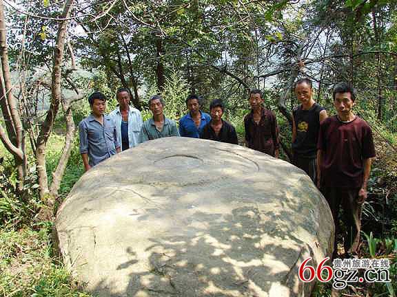 为觅寻祖先们刻在蜂糖山上的历史文化,2009年我带领夜郎竹王文化研究会部分成员到蜂糖山寻找,历经三个月。2009年8月13日终于在蜂糖山上发现了一块巨石,材质为磨刀石,表面平滑,长2.8米、宽2.2米、厚1.3米,约重12吨。表面均刻有各种各样的图案。由于大家都看不懂叫天象图。发现这个天象图后为清洗和辨认,我自带干粮,由马鞍山步行先后十上蜂糖山。