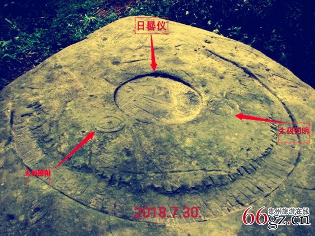 1、2018年7月30日,贵州民族大学研究员王德埙先生现场接受安顺电视台记者采访,宣布经他多年研究,破译大石上有两件宝。即古代计时仪日晷,阴阳八卦太极图。