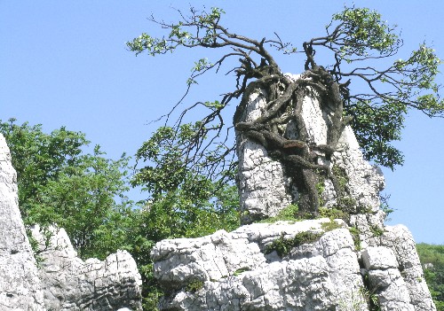 这里千姿百态的石头高高耸立,独个成景,连片成林。最妙的是石头上长树、缠藤,仿佛人工培植的巨型盆景,天然成趣,巧夺天工。这是石林内的天然盆景。